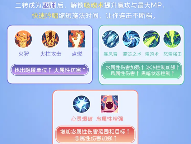 2、二转成为巫师后,解锁吸魂术提升魔攻与最大MP,快速吟唱缩短施法时间,让你连击不断档。