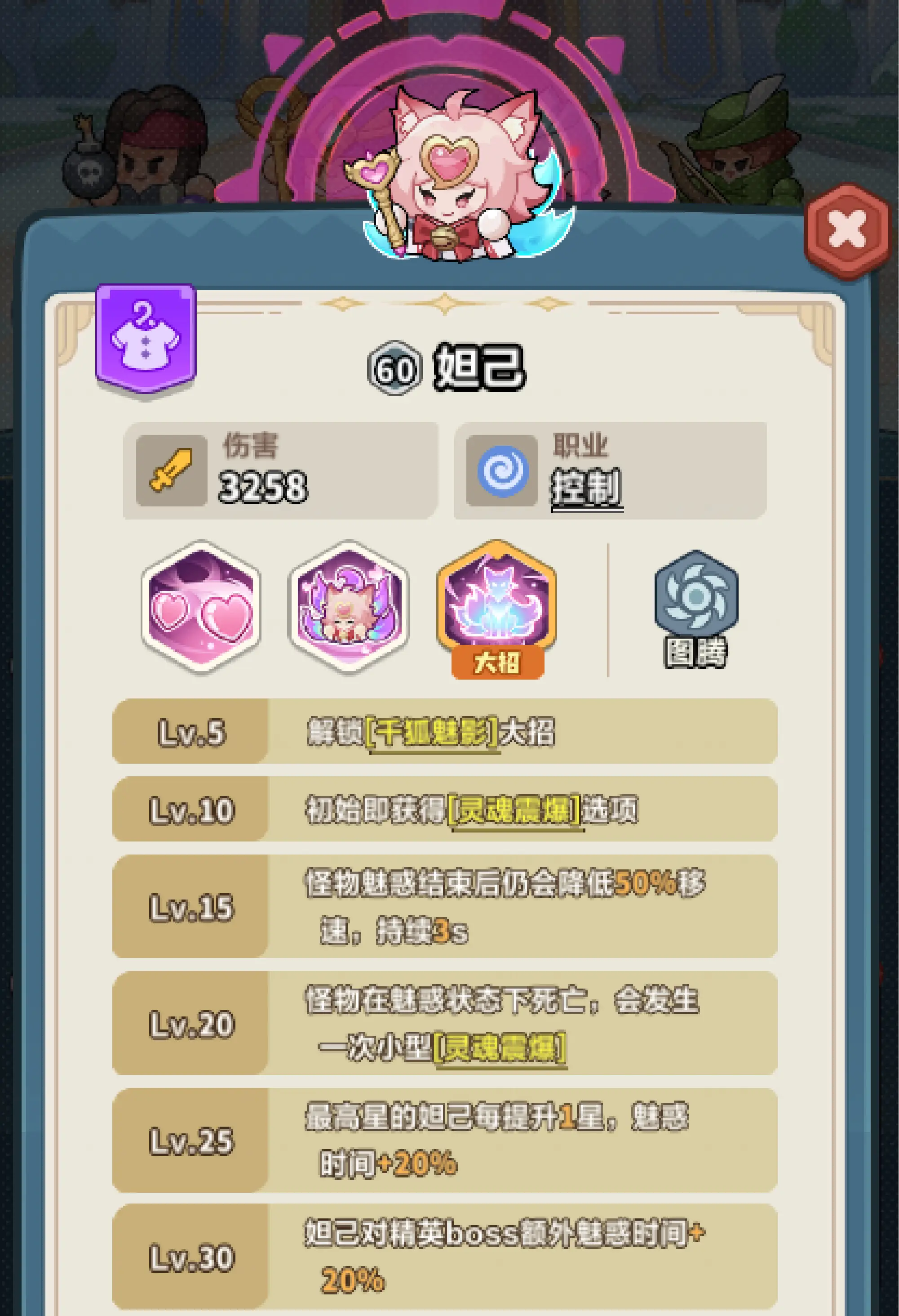 最高星的妲己每次提升1星,爱心的持续时间与魅惑时间增加。