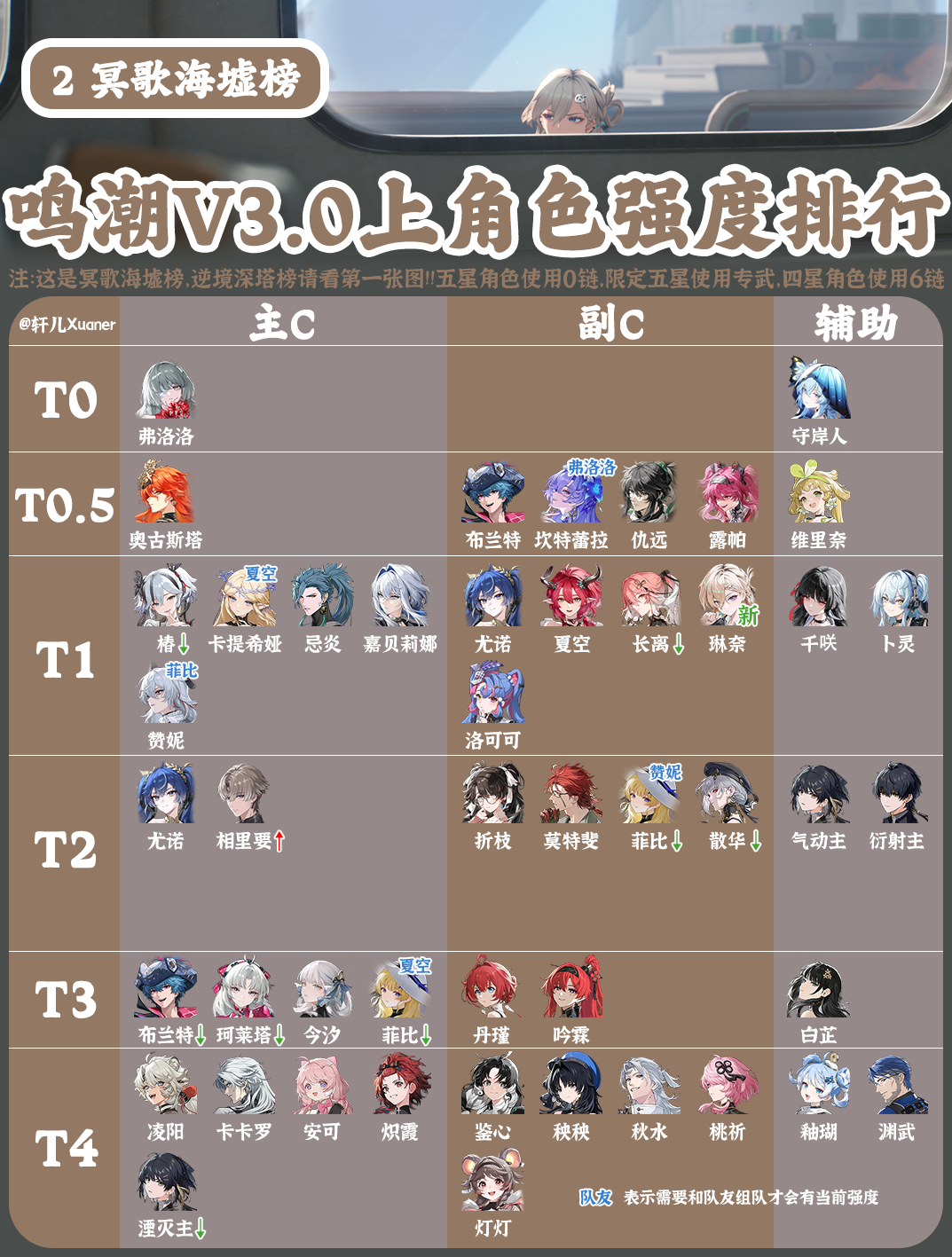 ⑦ 其余调整:相里要冥歌海墟榜由T3上调至T2。长离冥歌海墟榜由T0.5下调至T1。副C菲比/散华冥歌海墟榜由T1下调至T2。