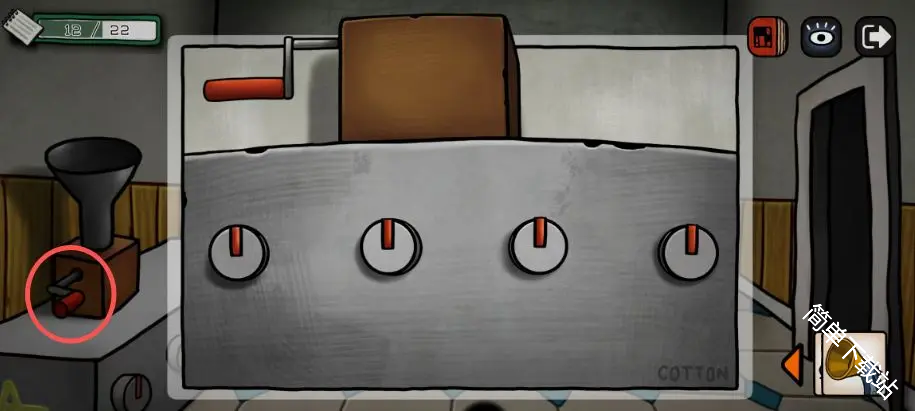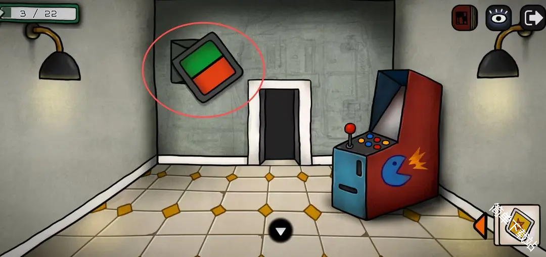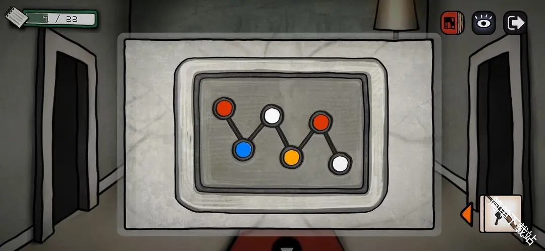 4、灯泡亮起,根据灯闪的颜色顺序按后面门(和几个灯泡亮没有关系,红色一开始闪了2次),所以是红红蓝黄蓝红黄;点击中间的灯泡,可以获得道具灯泡,这里别忘了拿;