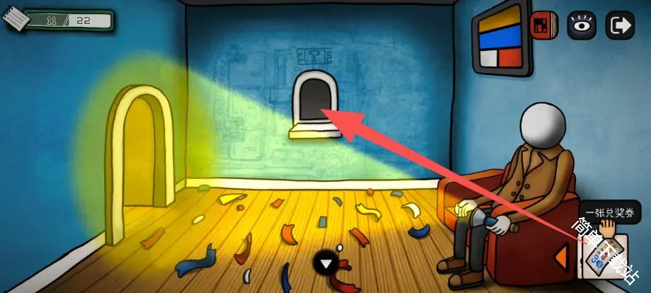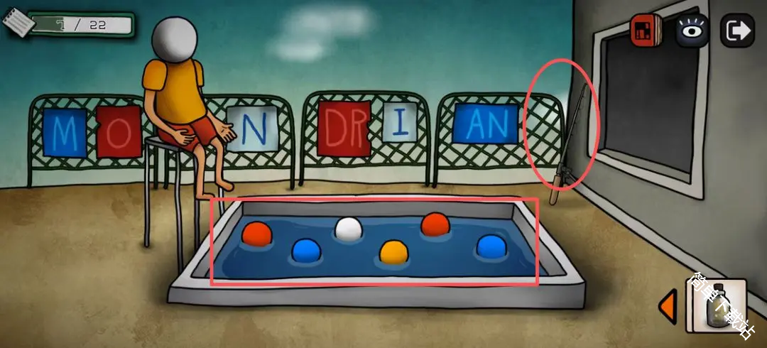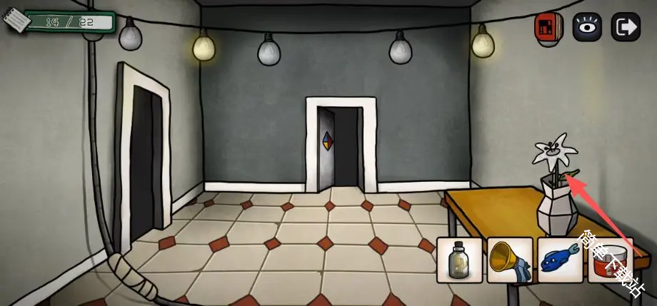 12、获得道具鱼竿,这里彩球获得的线索用来开红毯房间的门,就是那个扑棱蛾子飞灯泡,飞走后的密码