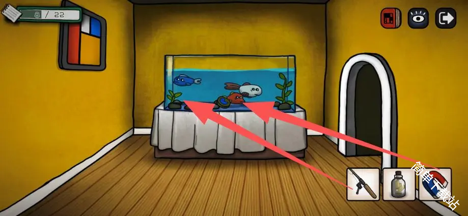 14、鱼竿在鱼缸这里使用获得蓝色的鱼,同时吸铁石也在这里用,获得一个圆形的石头(硬币)
