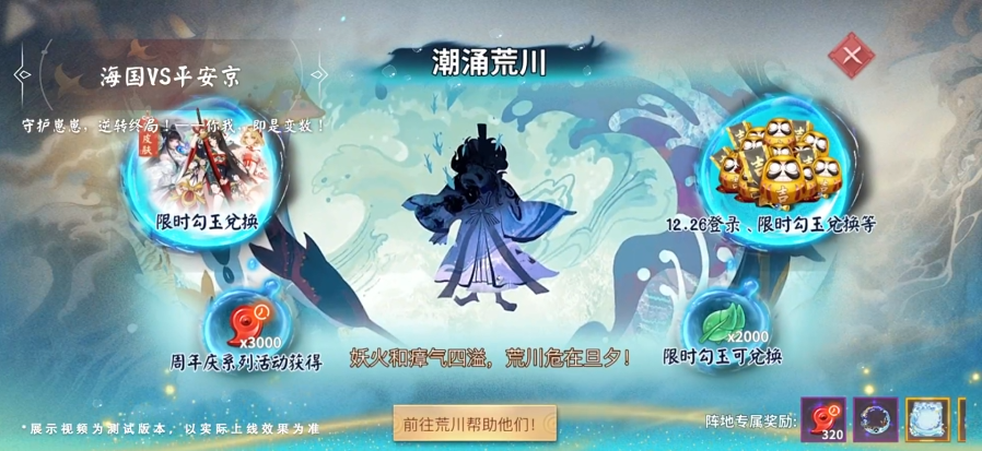 活动背景设定于危机四伏的荒川——妖火蔓延、瘴气弥漫,“潮涌荒川”事件全面爆发。全服阴阳师需联合抵御海国势力侵袭,共同维系平安京秩序。参与即有机会限时兑换勾玉,首日登录还可领取专属签到礼;叠加周年庆期间发放的勾玉资源,整体收益十分丰厚。