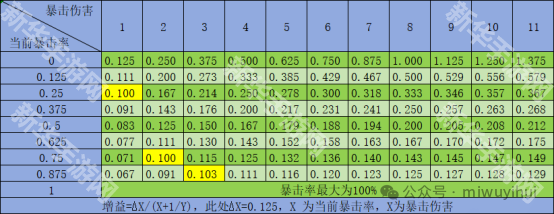 假设当前暴击率为X,暴击伤害为Y,期望伤害为1+X*Y。∆X为增加的暴击率,那么∆X带来的期望伤害增益为:(1+(X+∆X)*Y)/(1+X*Y)-1=∆X/(X+1/Y)。如对于主副手暴击率词条为12.5%,在暴击率0.8、暴击伤害4的情况下,1条暴击率词缀增益为:0.125/(0.8+1/4)=0.119。下面给出一个12.5%词条的表格词条选择供参考,第一列代表当前的暴击率,第一行代表当前的暴击伤害,内容区代表处在当前暴击率和暴击伤害情况下,增加12.5%暴击率带来的收益。由于收益与∆X正相关,如果∆X为其它值时,将表格内容区的收益乘以词条的比值即可,如前续例子中,若增加暴击率为16%,那么收益为0.119*0.16/0.125=0.152。