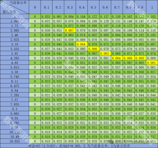 假设∆Y为增加的暴击伤害,那么∆Y带来的期望伤害增益为:(1+X*(Y+∆Y)/(1+X*Y)-1=∆Y/(1/X+Y),引用公式注意排除X=0的情况。如对于主副手暴击率词条为12.5%,在暴击率0.8、暴击伤害4的情况下,1条36.5%暴击伤害词缀增益为:0.365/(1/0.8+4)=0.0695。下面给出一个36.5%词条的表格词条选择供参考,第一列代表当前的暴击率,第一行代表当前的暴击率,内容区代表处在当前暴击率和暴击伤害情况下,增加36.5%暴击伤害带来的收益。由于收益与∆Y正相关,如果∆Y为其它值时,将表格内容区的收益乘以词条的比值即可,如前续例子中,若爆词条为48%,那么收益为0.0695*0.48/0.365=0.0914。
