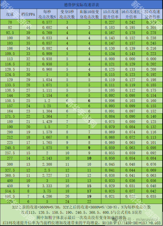 由于每个职业攻速档位不一致,下面以德鲁伊为例,先给出一张实际攻速详表。后3列攻速提升倍率为当前档位增加攻速带来的平均增益,如400攻速到450攻速区间,平均攻速收益为(10/9-1)/(450-50)*15)=0.033。