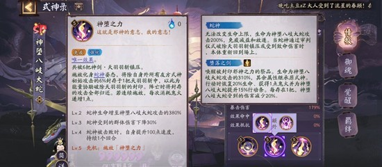 二技能:施放,进入蛇神状态,将所有友方式神的初始攻击的6%封印在天羽羽斩中,蛇神状态被击败,提升自身100点速度。