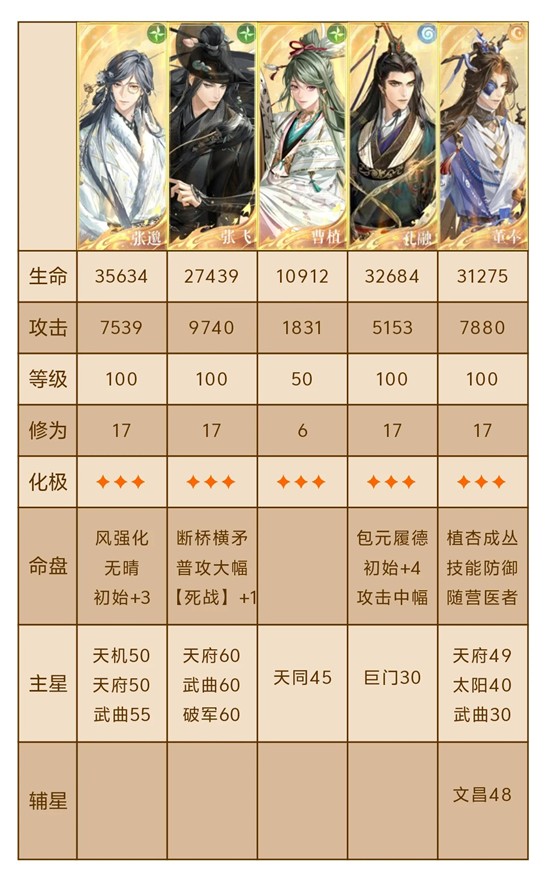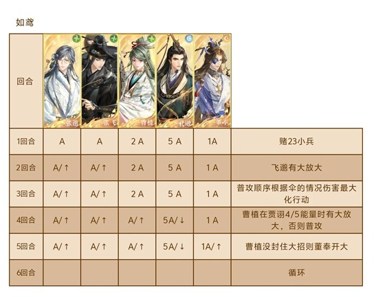 有几次被封大招也正常,跟着表格调整过来,除了曹植其他人都能防御,尽量让曹植在贾诩4/5能量时能放出大招。
