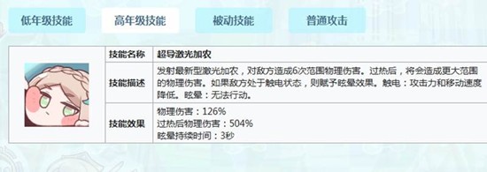 晋升到高年级后解锁的超导激光加浓是爱蜜莉雅技能的点睛之笔。该技能能造成6次连续的范围伤害,叠加后形成巨额的范围输出,足以清扫大片的敌人。更巧妙的是,如果目标已经处于触电状态,还会被附加长达3秒的眩晕效果。这个无法行动的真空期,为队友创造了绝佳的输出窗口。