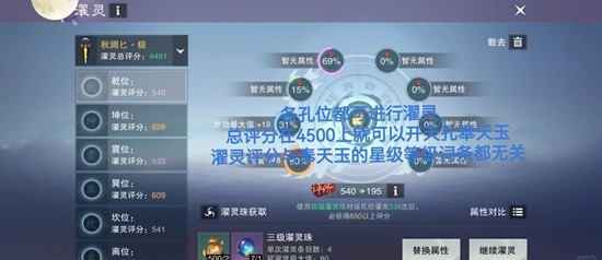 使用濯灵石(尽可能用高等级的,四级有保底,但是很远)可以对各孔位进行濯灵(濯灵不受奉天玉属性影响),然后总分加起来够4500,就可以开天孔了
