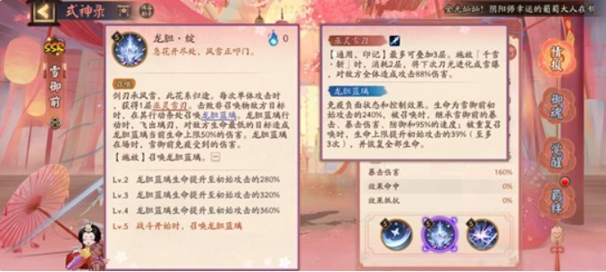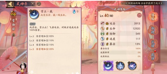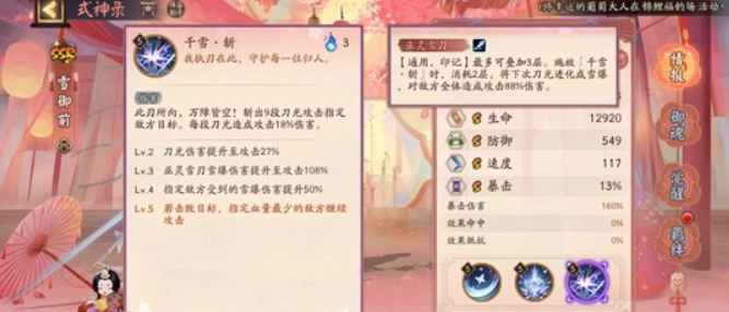 雪御前技能包含“雪立·裁”与“龙胆·绽”,觉醒后攻击与生命属性获得强化。居住高阁期间,通过俯瞰平安京洞察暗藏裂痕,性格逐渐显露深沉特质。