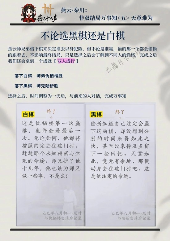 孤云师兄弟借下棋来决定谁去以身犯险,但不论是谁赢,输的那一个都会偷偷的跟着去,不影响最终结局,只是选择之后会了解到不同人的性格,完成之后我们还会拿到一个成就【双人成行】