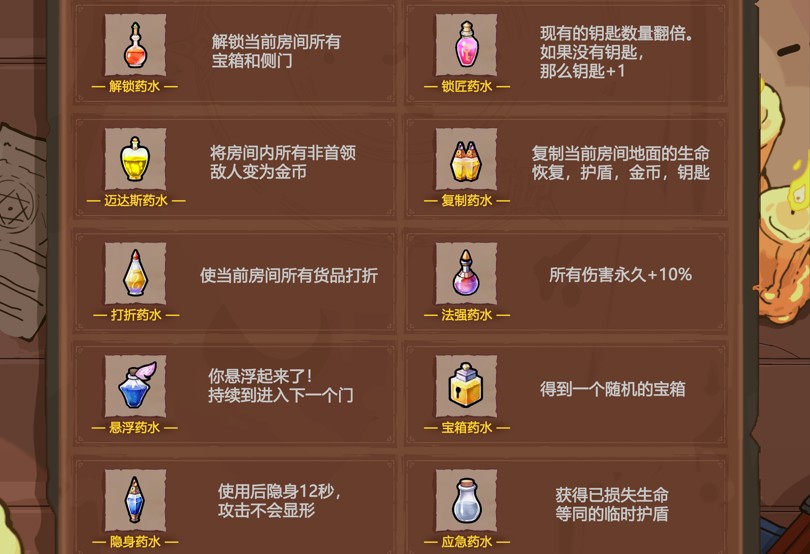 11、解锁药水:解锁当前房间所有宝箱和侧门