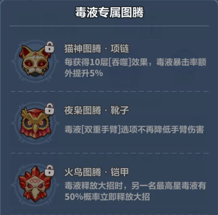 除专属图腾外,优先推荐【暴击率】、【每个词条提供所有伤害增益】、【三个词条职业增伤】这些通用词条。其次【负面状态增伤】、【中毒伤害增加】、【毒系职业增伤】等相关图腾也有不错的效果。