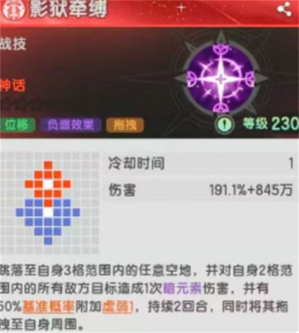效果:对2格范围内敌人造成一次伤害,附加虚弱效果,并将敌人拖拽到自身周围,通用控制技能,可配合群攻技能形成连击或限制敌方位置