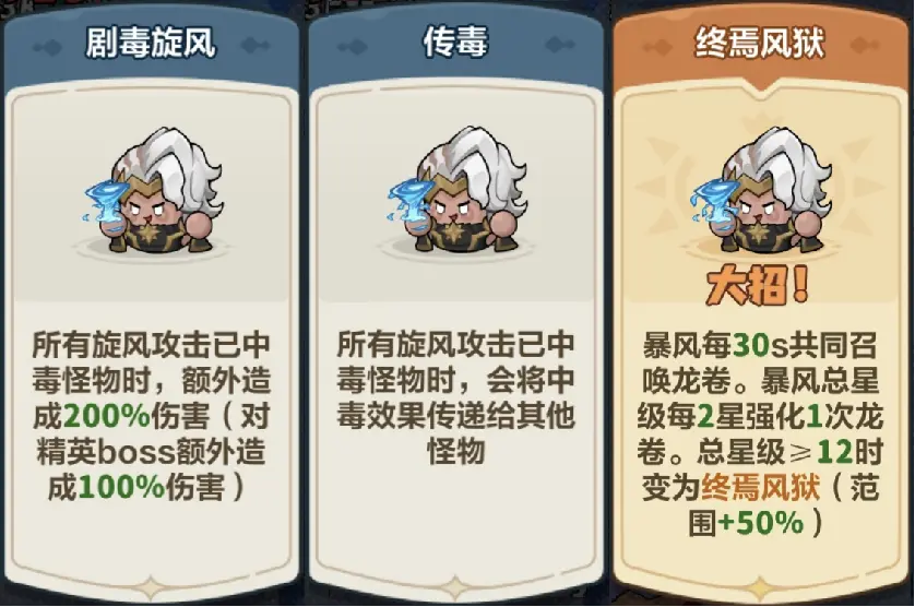 1、暴风优先凑8 - 10只且多合成2星及以上最好,能搭配暴风大招【终焉风狱】星级需求-2,伤害+50%的图腾更佳,暴风优先选风如刀刃、千刃横飞等风刃类词条,3条以上风刃词条后可抛弃大招避免影响输出频率,再补剧毒旋风。