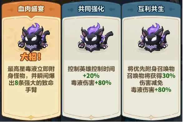 职业联动技能则分别适配于控制和召唤英雄,能一定程度上延缓怪物进攻的速度,让毒液的输出环境更友好,可根据阵容适配进行选择。
