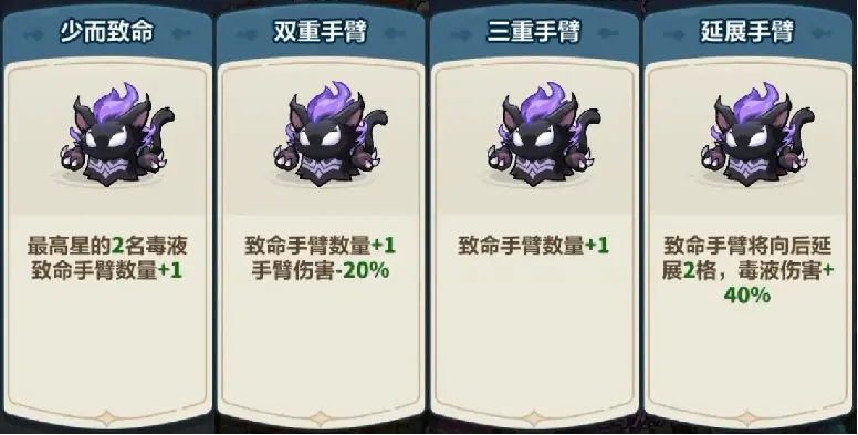 手臂强化类的强化词条主要通过增加手臂数量和手臂长度,提升毒液的攻击距离和伤害,前期提升较为明显。