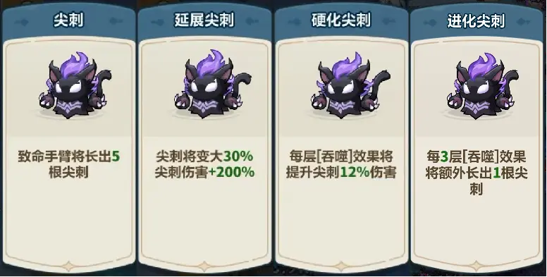 部分吞噬强化会提升吞噬层数上限或提升伤害结果,部分则会作用于尖刺,提升尖刺的数量或伤害,但需要一定的成型时间,不推荐在开局选择。