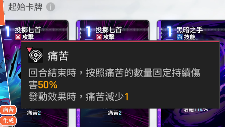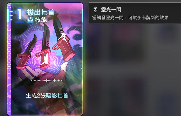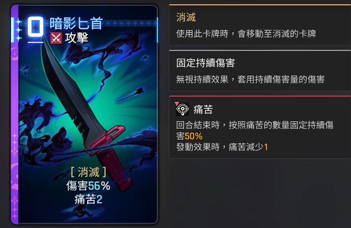 那这里进行生成的时候就是零费的普通匕首了,所以如果要玩奶刀的话,基本上每一把都是去赌能不能拿到暗影上膛的强化版本,拿到之后还不行,至少给他复制一张或者2张,否则匕首数量是不够用的,那么除了变体4以外,最推荐的可能就是变体3,这里可以让卡牌治愈108×X,然后生成X张的暗影匕首,也就是说大家每用掉一点的能量,就能拿一张暗影匕首,另外一个值得推荐的是这个二费的群体效果卡,如果选择了这个变体,那大家就需要想办法多弄几张暗影匕首在自己的手里,因为她的基础效能实际上已经比匕首要强了,因为匕首是达到50%数值之后上痛苦,而这个群体的暗影上膛首先基础伤害就多了30%,并且依旧上痛苦,还能解决德蕾莎的缺点,就是她没有办法对群。