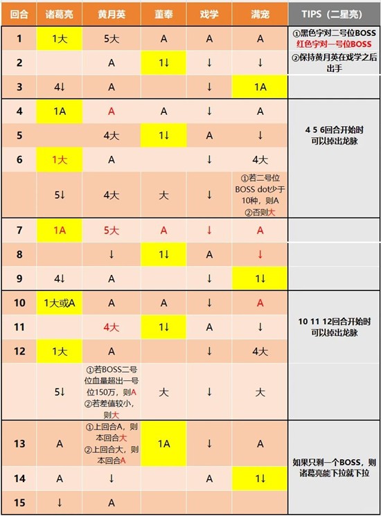 一号位BOSS机制:月英外的四人每次平A,BOSS获得一点能量。它大招后,我们需要保证本回合和下一回合不能再有BOSS大招。