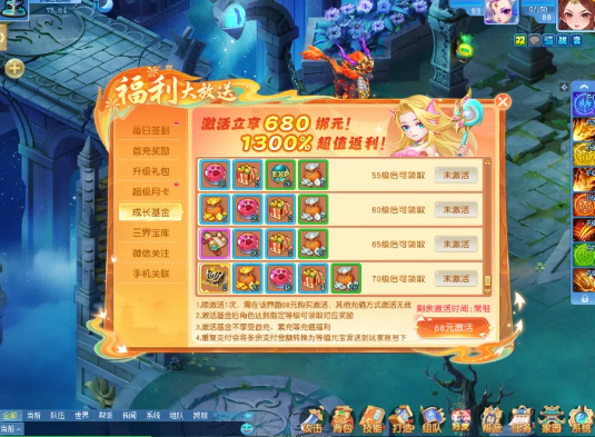 激活后,你可立即获得680绑定元宝。更重要的是,此后每当你达到指定的等级里程碑,即可领取对应的丰厚档位奖励(共8个等级档位),累计可获得超过原始投入1300%的超值回报。