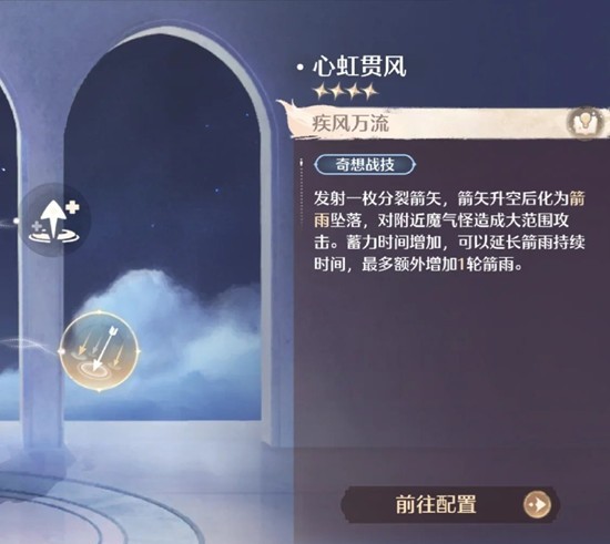 建议用初始弓+奇想战技净然之思+奇想战技疾风万流,buff首选疾风万流强化,其次削韧,再次弓弦能量恢复,再再再次移动速度提升。