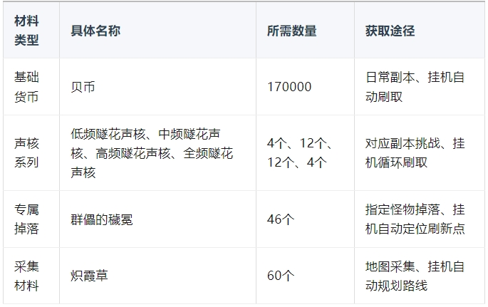 重复素材:贝币与各频率隧花声核(天赋等级越高需求越多,建议挂机提前囤货,避免后期紧缺)。