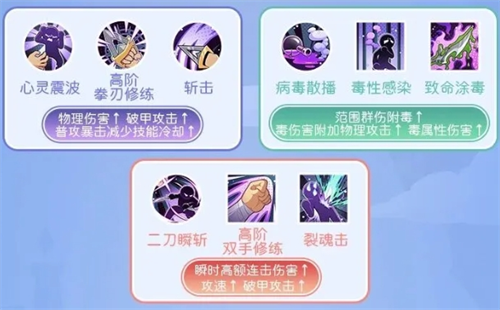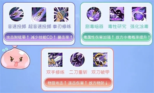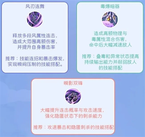 2、二转成为刺客后,解锁翻滚躲避和影刃分别提高攻速和闪避,隐匿强化则可以提高暴击率,减少技能CD,让后续的连招更流畅。