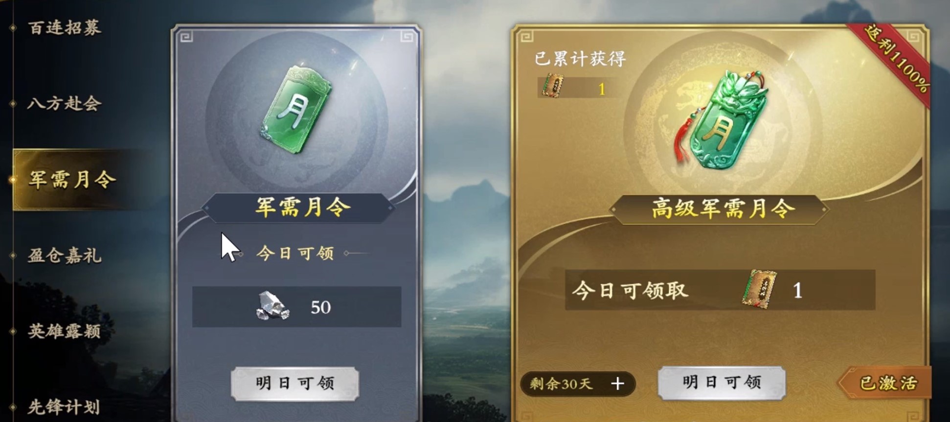 全角色按品质划分为稀有、史诗、传说三档,分布于不同国家体系中。初始阶段,玩家可通过开服登录、连续签到及武将拜访等零门槛活动,稳定获取10名基础武将。此后进入资源规划阶段:核心付费模块包括月卡(30元)、战令(提供38元与128元两档,推荐选择38元档以兼顾性价比)、新手成长礼包(总计约200元,含新手招募礼、日/周/月名奖礼)。上述三项合计可为玩家提供约40至50次抽卡机会,并叠加新手礼包带来的额外数十抽,使首波累计抽卡量接近100次。