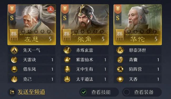 战法配置方面,华佗优先选择刮骨疗毒、资军后勤、天香等兼具治疗与减伤效果的技能,进一步强化队伍容错能力;左慈与张角则推荐搭配雷暴、借东风、太平道法、克己等主动输出类战法,构建多段伤害链与状态压制体系。