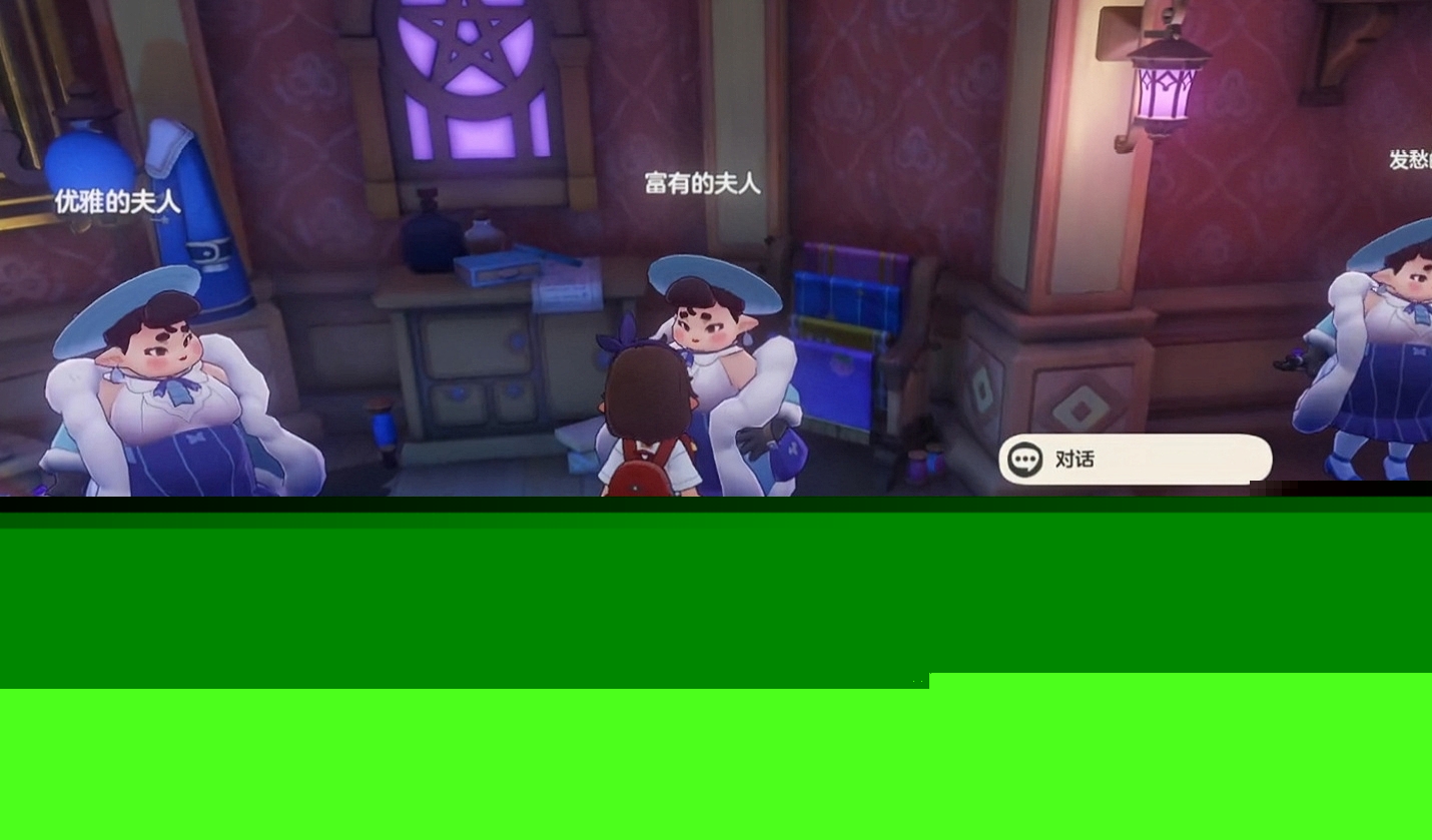 前行至第二区域,场景切换为多位身着华服的夫人。此处需识别出外观异常者:所有夫人服饰均绣有蝴蝶纹样,唯独一人衣饰无此图案。在调查过程中,注意角落处散落两枚魔法石;黄棕色矮柜可推动,首次推动后可于柜内取得游戏币×3;继续前进,另一同款矮柜亦可移动,移开后其后方角落藏有普通咕噜球一枚。随后与“热爱艺术的夫人”交谈,她将提示辨识线索。确认目标后触发战斗,对手为小夜的完全体形态——朔夜伊芙。需特别注意:若未能首回合击倒,它将发动“隐藏条款”技能,强制交换我方与自身当前所用技能。获胜后,地面将浮现超级华丽宝箱。