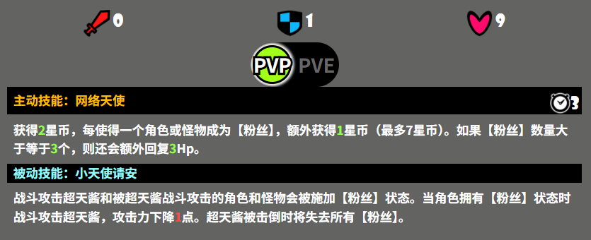 技能设计方面,超天酱的主动技能可稳定获取2枚星币;每当有1名角色或怪物进入“粉丝”状态,额外获得1枚星币,上限为7枚。若当前“粉丝”数量≥3,则自动恢复3点HP。其被动效果为:自身发动攻击或被攻击时,目标将附加“粉丝”状态。处于该状态的角色若攻击超天酱,攻击力将降低1点;当超天酱被击倒时,“粉丝”状态将全部清除。