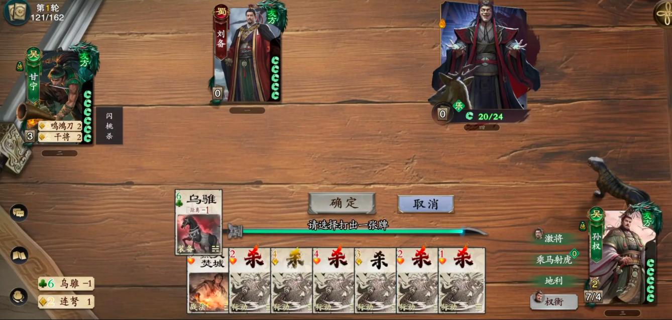 二号位由甘宁担任主攻手,专注执行高频干扰与精准打击。实战中优先使用“过河拆桥”“顺手牵羊”“烈火焚城”等具备强控场能力的卡牌,瓦解对手手牌结构、打断关键技能释放节奏;若缺乏控制牌,则启用“锦帆”类技能进行手牌重构,确保每回合都能保持有效压制力。