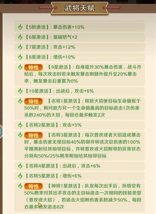 当孙悟空的名将等级提升至1星,将解锁更强大的天赋效果。当他的大招将目标生命值打到50%以下时,会自动对场上生命值最高的另一名敌人发动一次追击,造成240%的伤害系数,该效果每回合最多可触发两次。这让孙悟空在完成收割的同时,还能对敌方核心单位施加压力,极大地提升了他在战局中的战略价值。