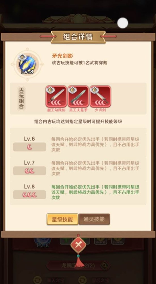 矛光剑影这套古玩组合由越王勾践剑、吴王夫差矛以及少虡剑构成,是开荒时期非常值得抽取的搭配。它主打先手控制流,其核心优势在于每回合必定优先出手,且不占用常规的出手次数。在巨神军师的各种PVP场景中,例如竞技场或巅峰对决,这套古玩能有效打乱敌人的节奏,为己方建立开局优势。
