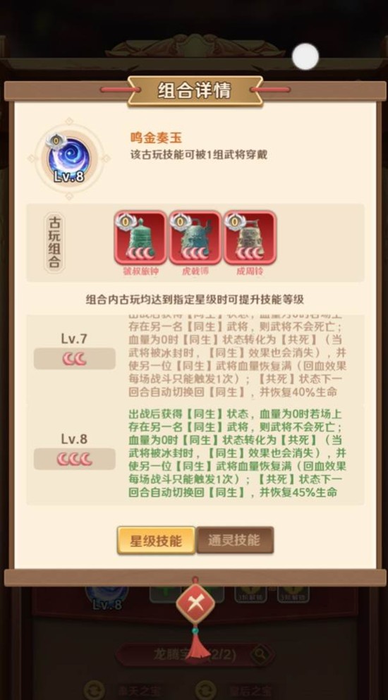 鸣金奏玉组合包含了虢叔旅钟、虎戟镈和成周铃,定位为生存续航流。它非常适合应对巨神军师中高难度的副本挑战或需要持久作战的跨服战斗。这套古玩能显著提升队伍的容错率,有效保护核心输出或辅助武将,避免被敌方集火秒杀。其出战效果是获得“同生”状态,当一名武将血量归零时,若战场上有其他处于“同生”状态的武将,则自身不会阵亡,并且另一名同生武将的血量会回满。