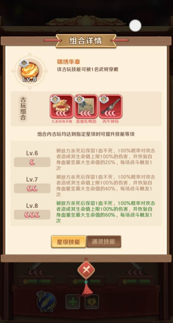 锦绣华章则由莲塘乳鸭图、九龙戏珠手镯和丙午神钩组成,属于反杀爆发流。它的效果是在武将即将被击杀时,保留一滴血不死,并立即100%反击出手的那名敌人,同时回复自身最大生命值的60%。在巨神军师的战斗中,这套古玩适合搭配高爆发的武将,能在竞技场、帮派战等需要逆风翻盘的场景中发挥奇效,改变战局。
