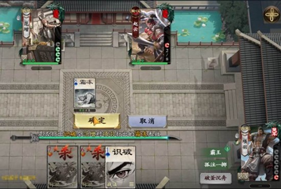 霸王是项羽的被动技能。在阵前对决的结算过程中,若项羽成为对决牌的目标且为主动使用者,则该牌的常规判定流程会被此技能替代。每当项羽通过此方式累计造成三次伤害后,可以自动获得一张阵前对决牌并加入手牌。这个技能为名将杀项羽提供了后期的持续压制和过牌能力。