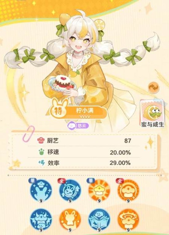 在解忧小食光中,柠小满是一位全局增益型的辅助店员。她制作餐点时,不仅能提升自身的厨艺值,还能为全体店员提供厨艺加成,这种效果对同样拥有“悠云”特质的员工尤为显著。她的存在可以有效提高菜品的最终售价,并提升整体的出餐效率。