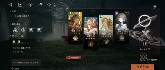 第三关:升阶,配置100助战。背后灵随便带的没用过。第一轮盯着曲娘多用debuff牌打,第二轮我用槲寄生一直石化左边的鹿,小马盯着右边打,维拉大招不要断,到后面鹿自己就没了,大约17回合