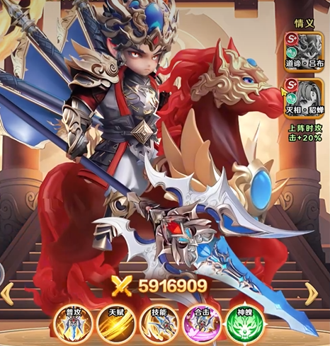 与灭相貂蝉的合击机制体现协同深度:需神蚀值蓄满方可释放,先净化全体控制与减益效果,再发动高额范围伤害;被动层面提供稳定伤害增益,双方同场时触发额外战力加成。虽基础增幅幅度适中,但伤害提升具有明确可观测性,推荐在核心阵容中保持双将共存配置。