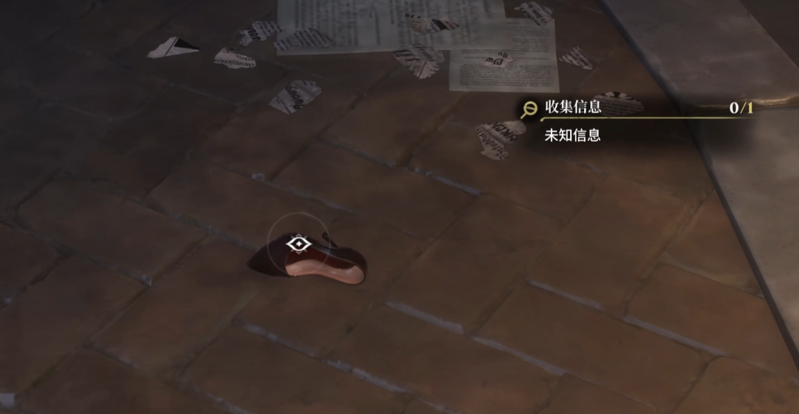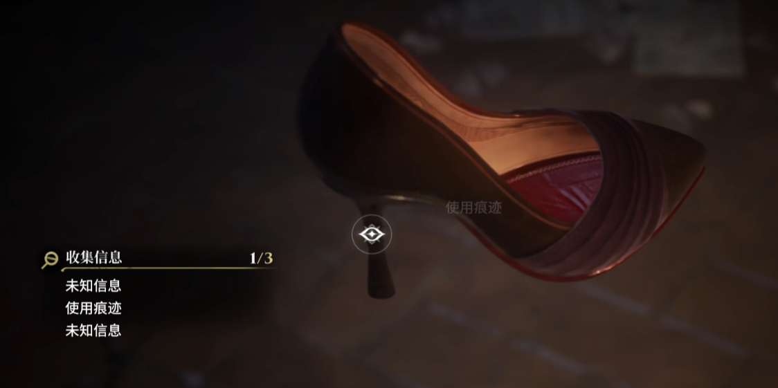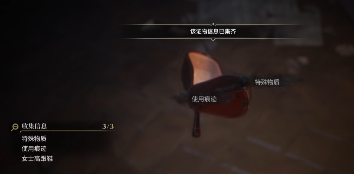 此时镜头聚焦于其手中所持之物:一双精致的高跟鞋。玩家需将其移交至警局备案,随后返回现场,在地面固定位置发现遗留的同款高跟鞋。靠近后启用调查功能(默认为鼠标悬停),系统将自动启动放大镜模式,完成细节采集。