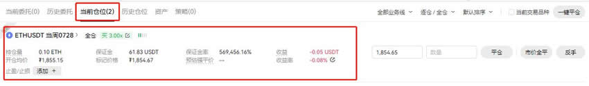 14、挂单成交后,可在持仓界面中可查看订单的相关数据,例如保证金、收益、收益率、预估强平价等。