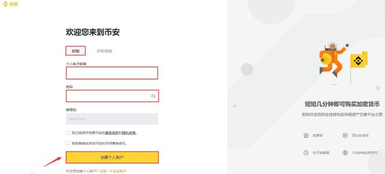 一、打开币安官网(),在页面左侧点击【使用手机号或邮箱注册】