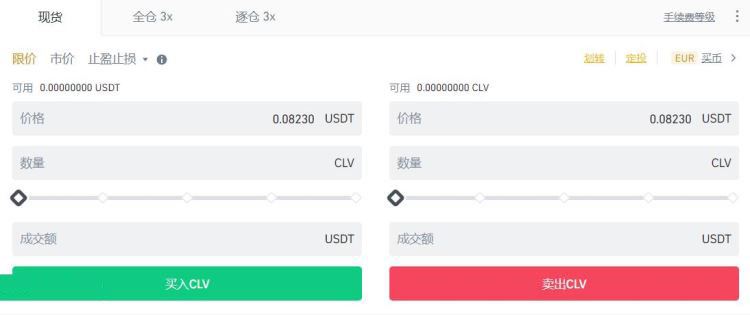 七、点击交易后,即可进入购买页面,注意选择CLV/USDT交易对
