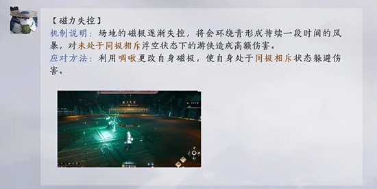 1-3:磁极变化,全程单次浮空不超过5秒。这个难点在于第一个P3磁力失控机制,你要卡读条极限最后两秒上去,然后风暴一结束就下来,或者提前一秒下来吃一次伤害不会死。第二个P4剑气青影,你被点名起飞的话,队友要第一时间救你下来。截止出新本当天,存在文本描述问题,并非全队任务,你自己全程单次浮空不超过5秒就过了。