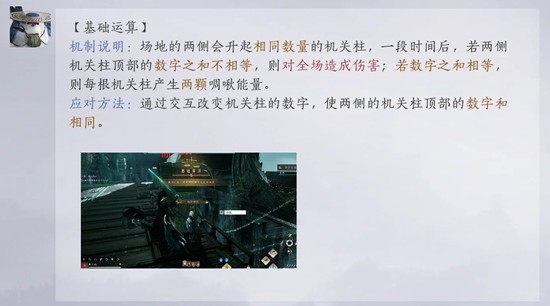2-3:安排两个人专门算数,如图标点左右两侧1和2,算法机制天秤左侧的数字对应1号侧柱子,右侧数字对应2号侧柱子,安排两个会的人专门算,一律调9,其他人不要干涉。然后虽然天赋说只有进阶运算需要调9,但是我懒得看,所以每次出这个机制我都调9。