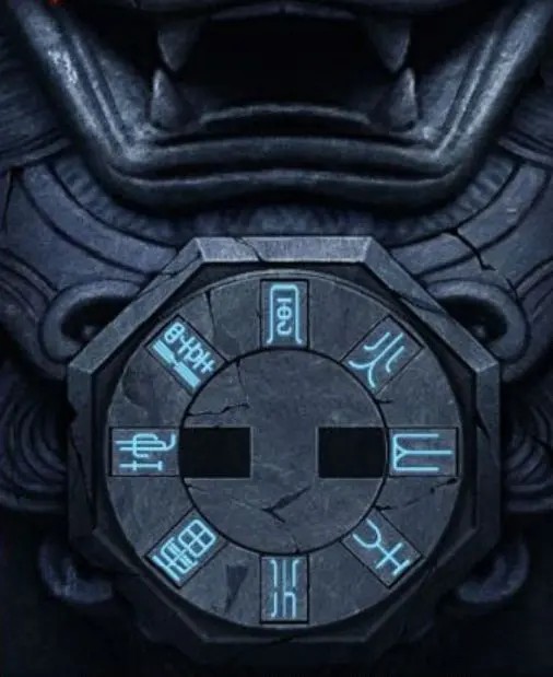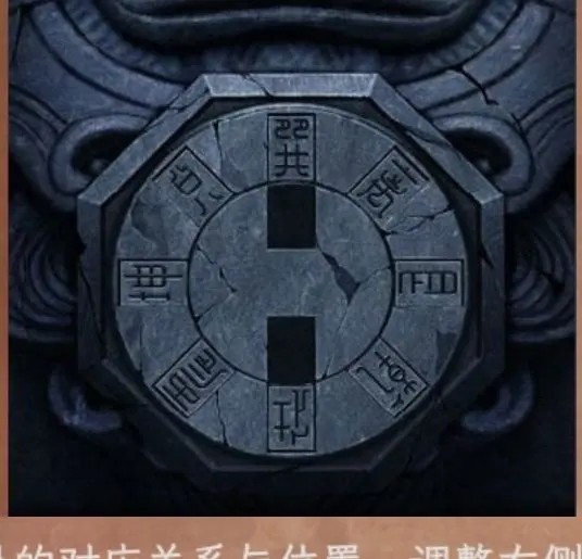 3.根据亭子窗口的纸上文字和左侧狮子调整完成后的样子,得到物象与八卦的对应关系。