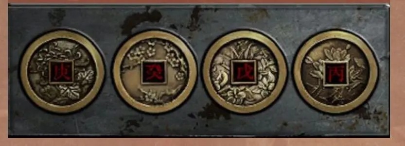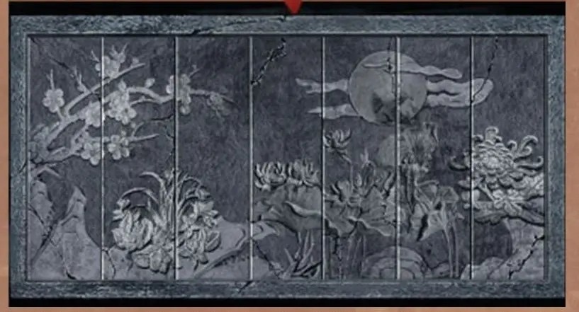 12.完成地上石槽的拼图,结果如图所示。完成拼图后,拼图中的花与石槽中的字相对应。根据石槽拼图和石槽中的字的对应关系,完成盒子的机关,答案如图所示。